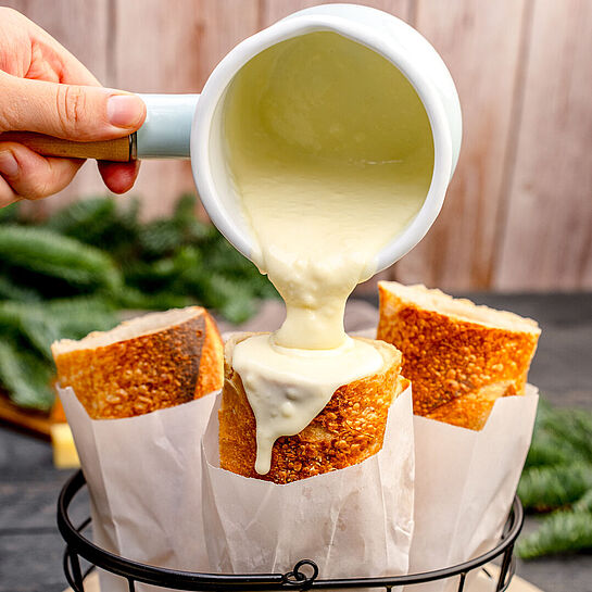 Den Käse mit Speisestärke bestäuben und unter häufigem Rühren zusammen mit der Gemüsebrühe schmelzen. Das Fondue sollte gut andicken. Zum Schluss mit Salz und Pfeffer abschmecken. Das Fondue in das Baguette füllen und genießen.